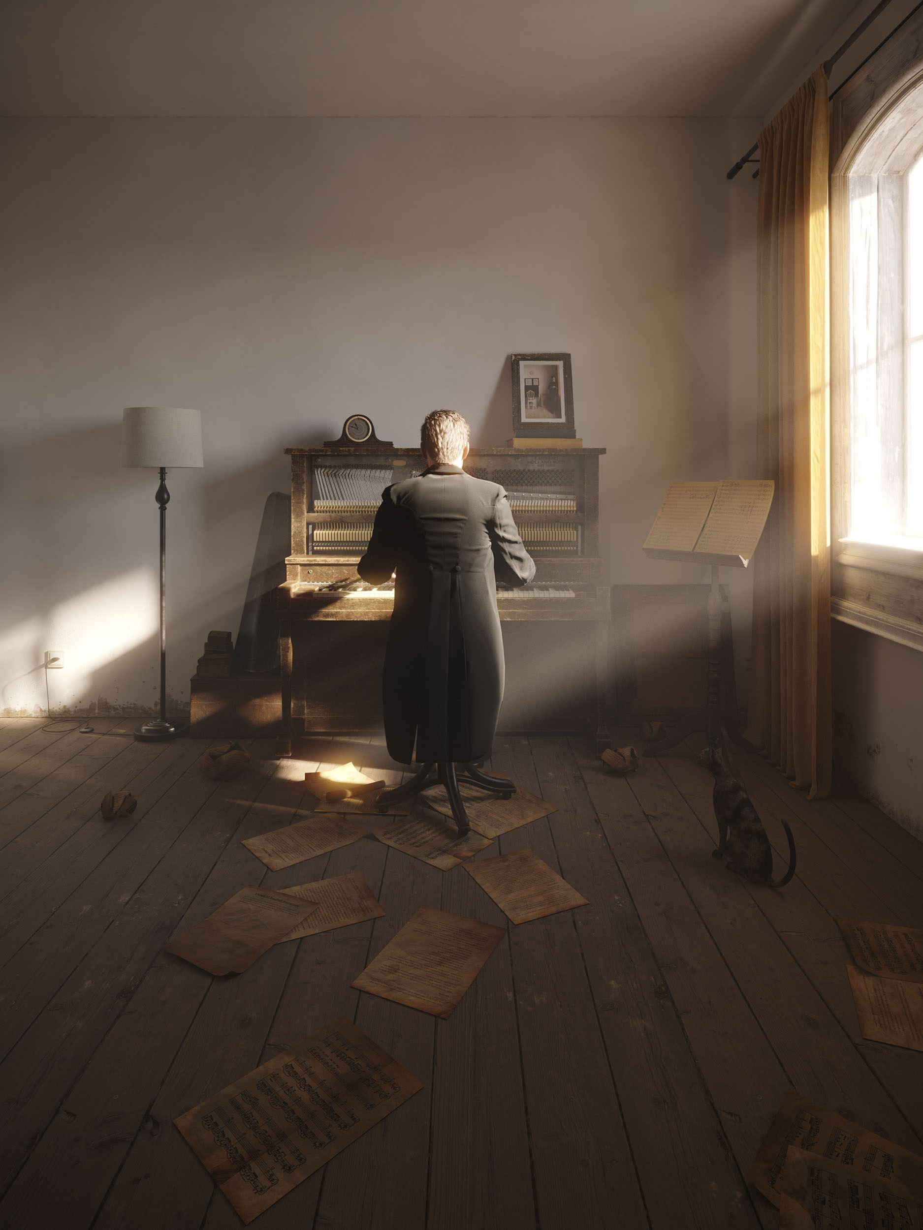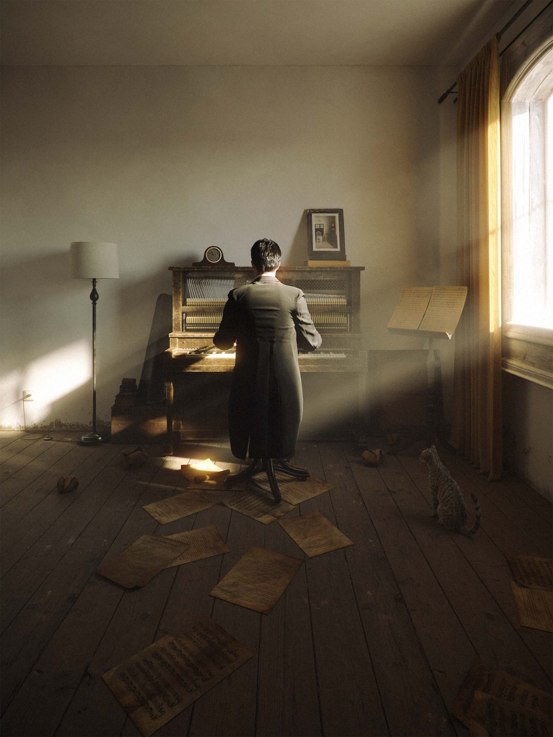 In our interpretation, the young man becomes a composer caught between creative attempts suspended in that familiar loop of uncertainty. The sparse room remains, but it now carries the weight of iteration rather than calm detachment. The scattered sheets on the floor tell the story.